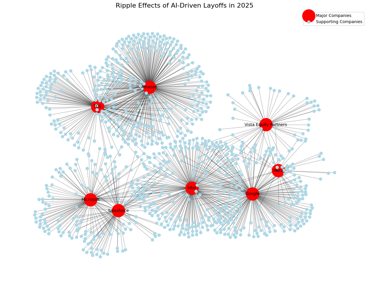 • Edges (lines) = Connections showing how layoffs cascade from the central firm to its ecosystem.
